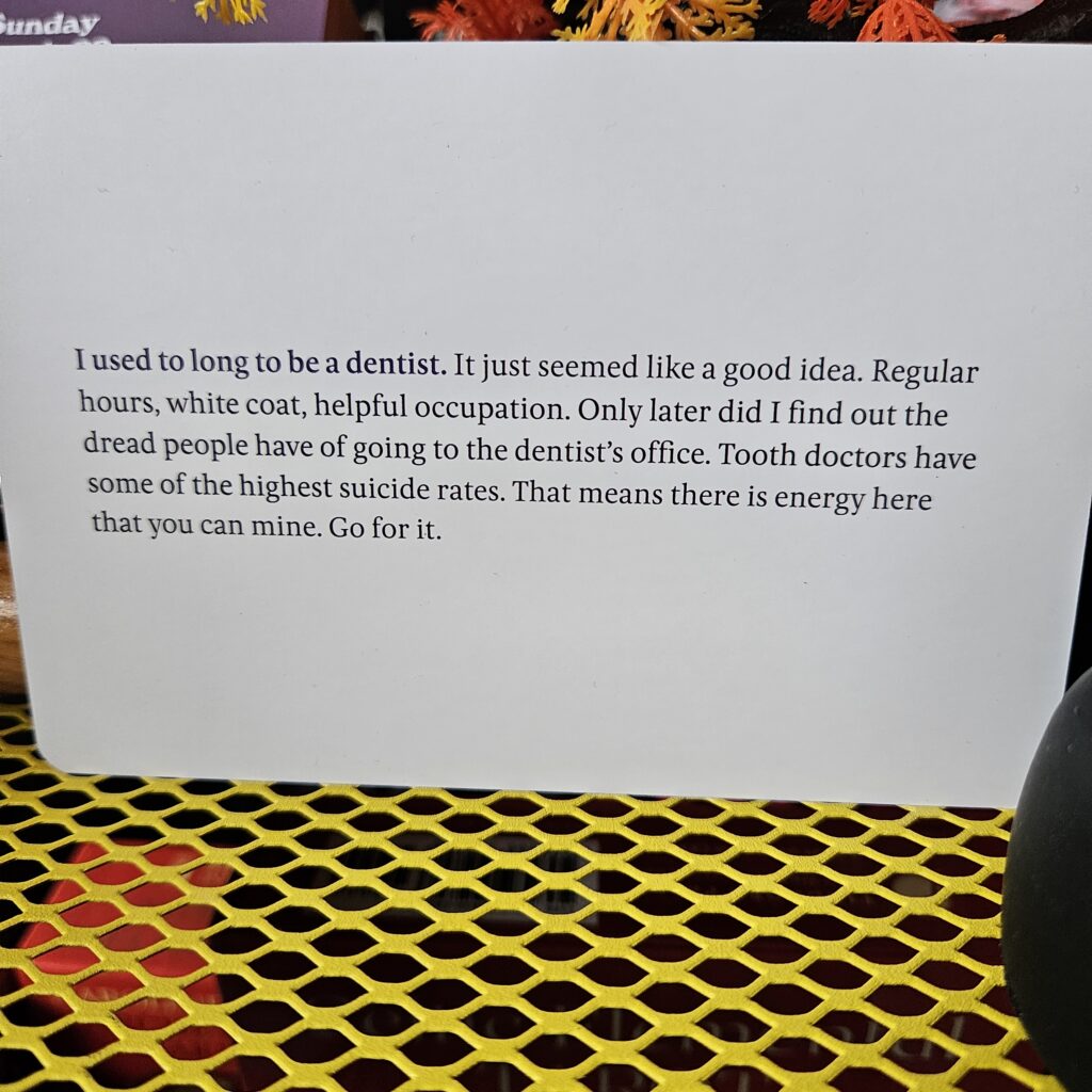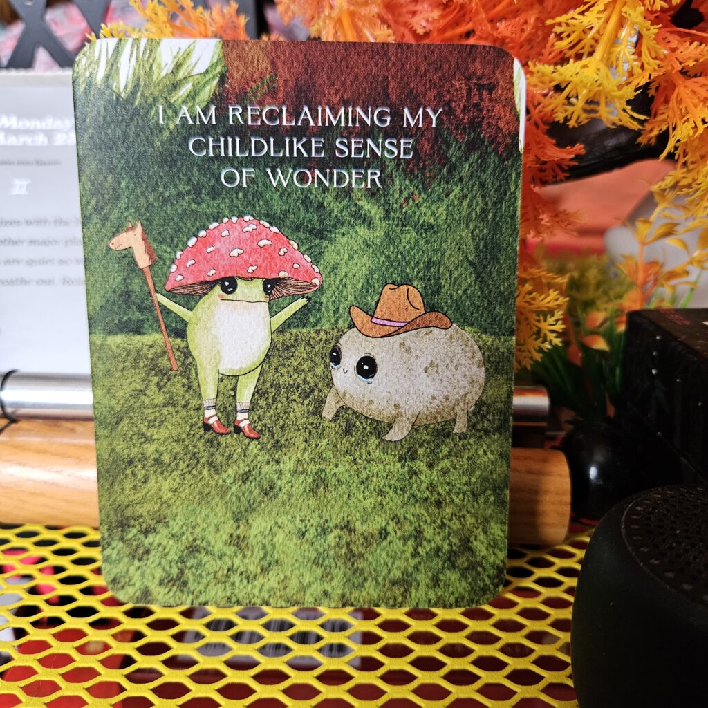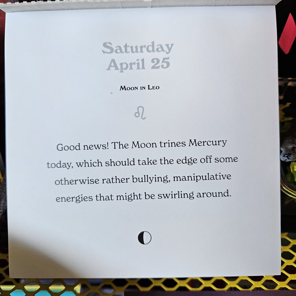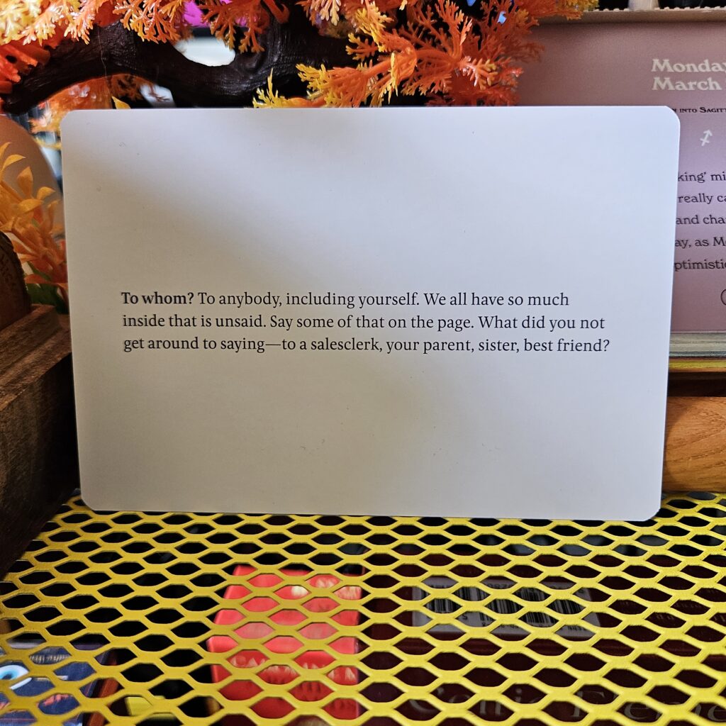 The (some version) cards I share, some have been in existence for eons, some people wouldn’t make a decision without their use, and some are affirmations and reminders to/for myself. I use these pulled cards as a starting point, a push to what I may need to remember for/about myself. I have nothing to profess about what is in reality an universal randomness of a shuffled counted out pick. I can say there are days the randomness is too on the nose.